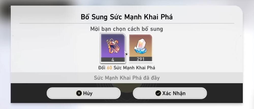Bạn có thể nạp ngay 60 Sức mạnh khai phá bằng cách sử dụng Nhiên liệu hoặc tiêu Ngọc Ánh Sao.