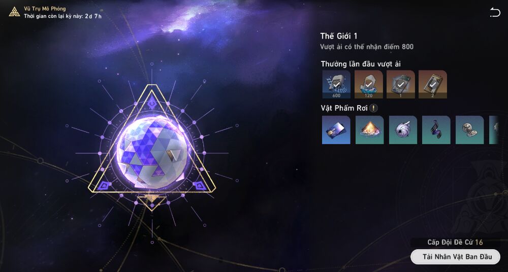 Vũ trụ Mô phỏng là một thử nghiệm chiến đấu, nơi bạn sẽ gặp các tình huống chiến đấu khác nhau mà bạn có thể tham gia để nhận EXP khai phá vào cuối mỗi thử nghiệm.
