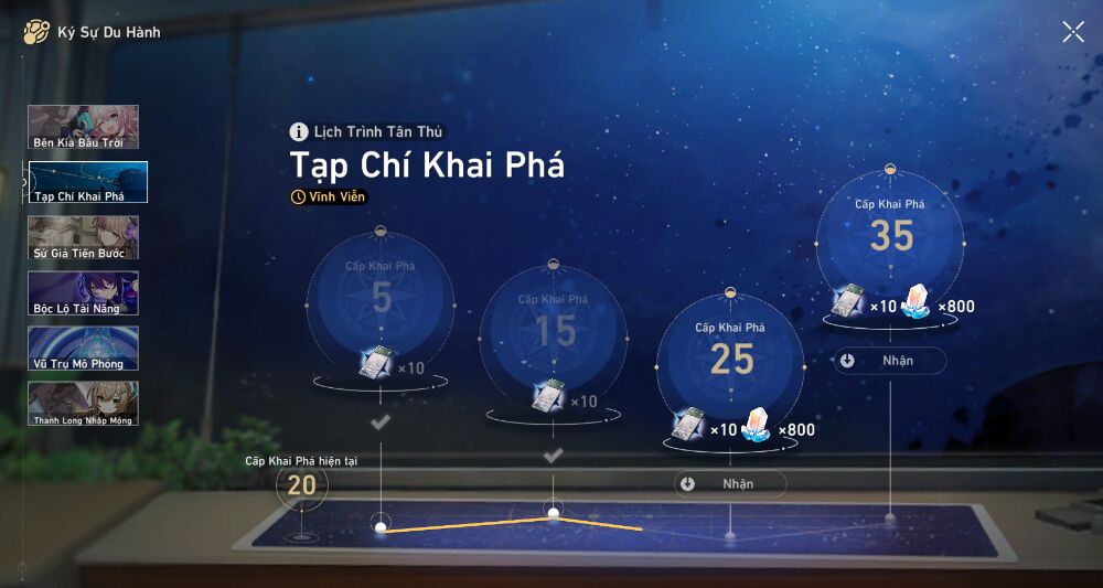 Sau khi đạt đến Cấp độ 5, bạn có thể nhận phần thưởng từ Ký Sự Du Hành sau mỗi 10 Cấp độ. Những phần thưởng này thường là Vé Tinh Cầu và ở các cấp độ sau là Ngọc Ánh Sao.