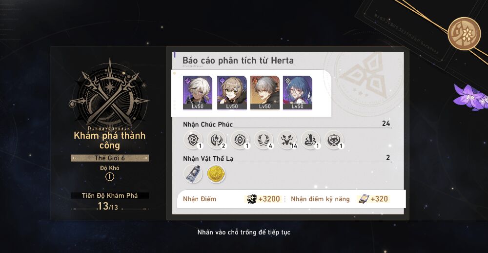 Hãy chọn đội hình gồm các nhân vật: Arlan, Nhà khai phá hệ Hỏa, Dan Heng và Natasha. Đội hình này sẽ giúp bạn vượt qua các màn chơi đầu tiên trong Vũ trụ 6. Vì những màn chơi đầu có nhiều kẻ địch yếu với Băng và Phong.