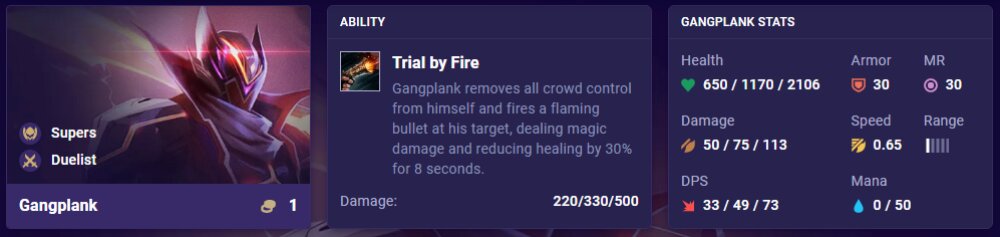 Gangplank is 1st gold champion and unique in Superman characteristics because the other two generals are 2 gold champions. He has an ability to simply shoot, dealing some damage. However, he also has a Quicksilver section built in when he clears out debuffs on use. With low mana, this can be quite powerful, as he will constantly purge himself from things like Morello Demon or Slow Attack Speed.