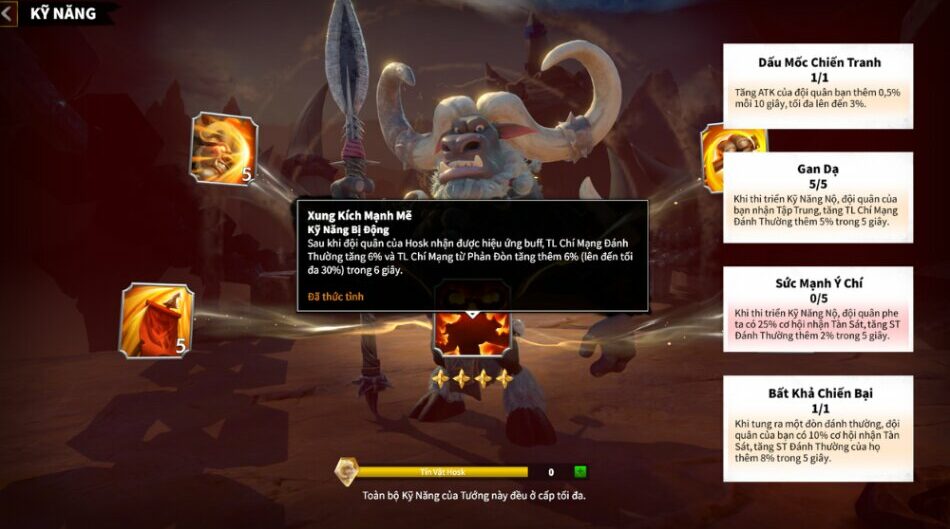 All talents such as “War Mark”, “Grit”, “Willpower” and “Invincible” will help trigger Powerful Charge to keep Hosk and Kinnara at bay. 30% rate critical attack with basic attacks and counterattacks.
