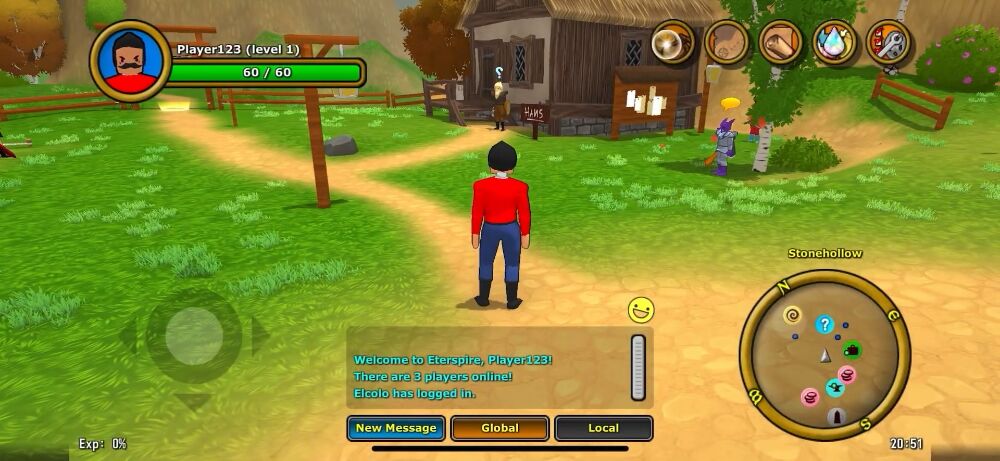 Eterspire including quests, social interactions, character development, map organization, and gear. As soon as entering the game, the player is given the option to set the appearance and name of his character. And then the player will be teleported to Stonehollow and they can explore the map.