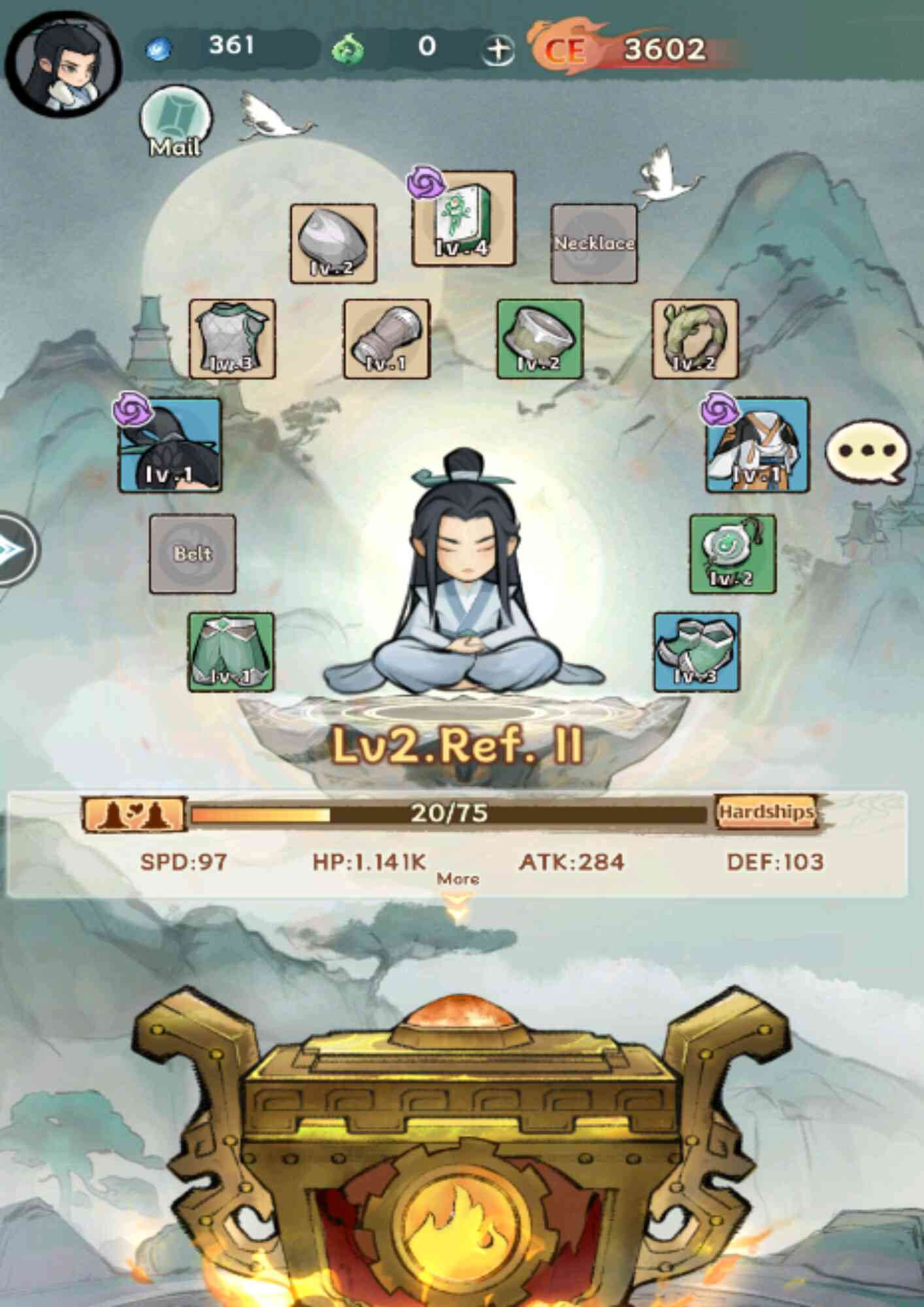 Immersed in picturesque scenes, you will continuously unlock chests, refine your equipment, face challenges, find immortal friends and traverse the vast path of cultivation.