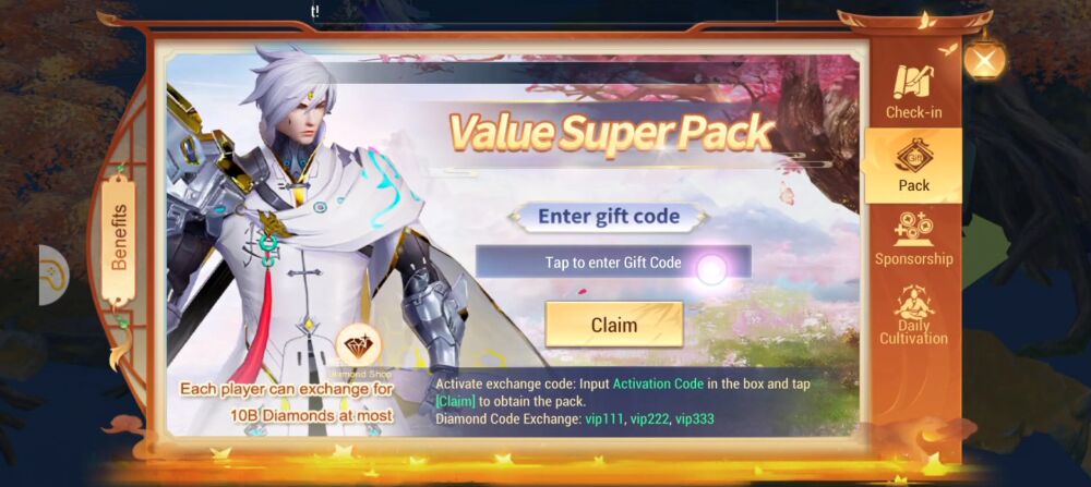 Step 3: Continue to select item "Pack". Enter the gift code in the table above into the text box. Then press "Claim" to get your reward.