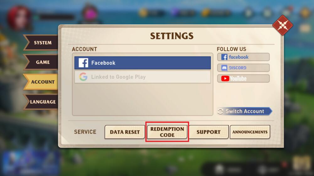 Step 4: Click on "Account". Select item “Redemption Code”.