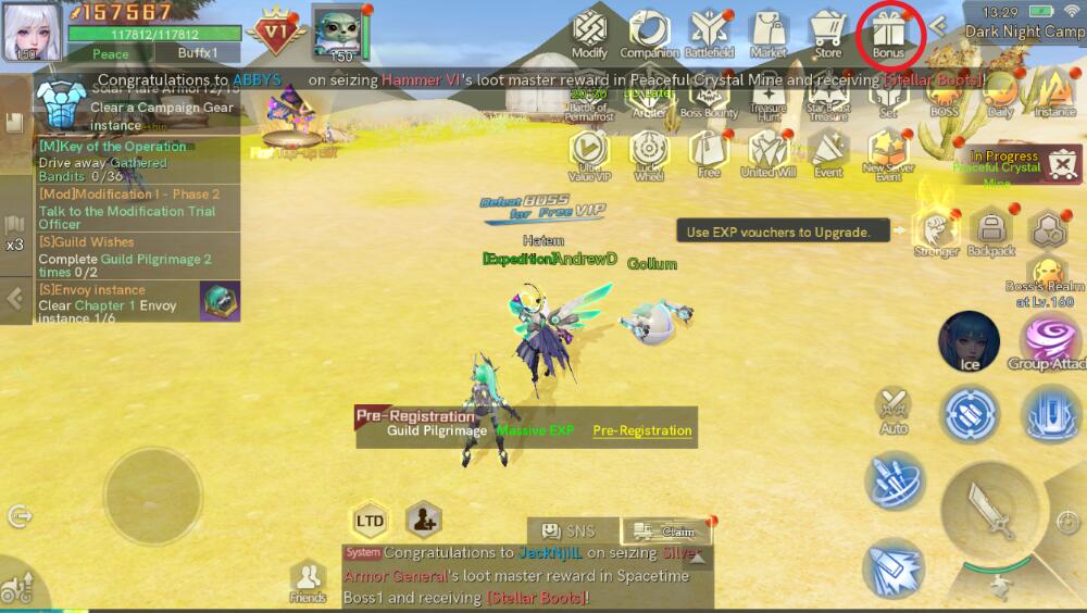 Step 2: At the main screen, click on the item “Bonuses” located in the upper right corner of the screen. You must pedal to level 150 to open the gift code redemption function.