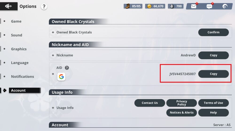 Step 4: Find the item "Account". Later copy AID to proceed to redeem the gift code.