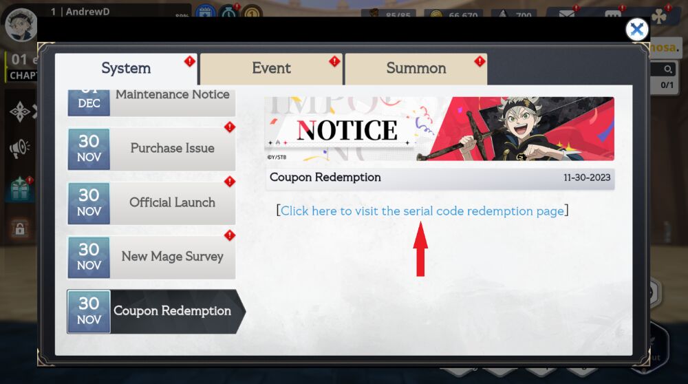 To redeem your Black Clover M gift code, follow these simple steps: