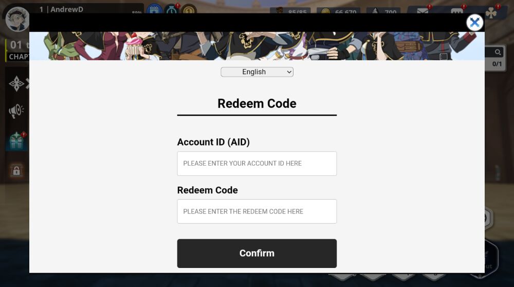 Step 7: Enter the AID you just copied above and enter the gift code in the text box. Click "Confirm" to get your reward.
