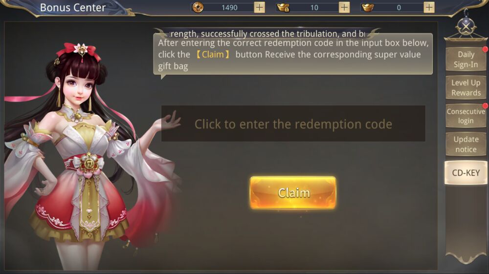 Step 3: Select item “CD-KEY”. Enter the gift code in the table above into the text box. Then press "Claim" to get your reward.