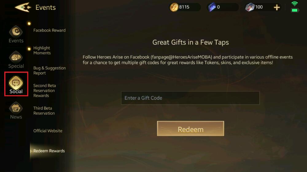 Step 3: Continue to select item "Social". Then click “Redeem Awards”. Enter the gift code in the table above into the text box. Press “Redeem” to receive rewards.