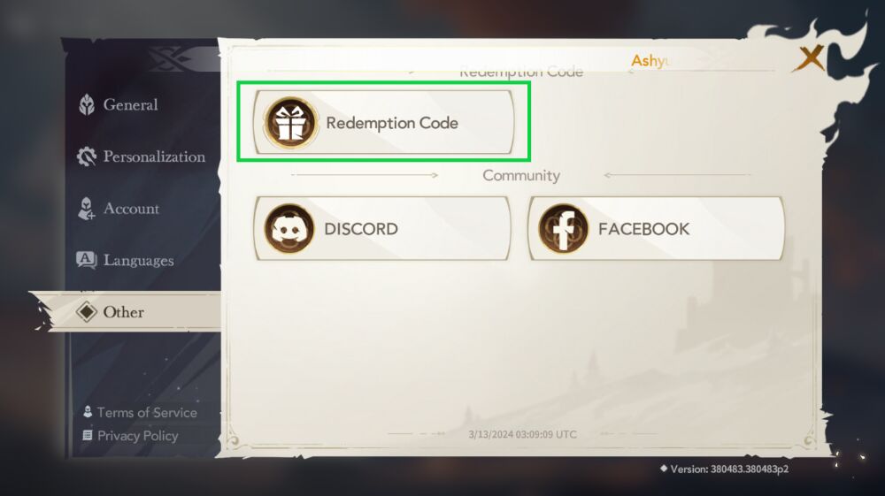 Step 4: Continue to select item "Other". Then select the section “Redemption Code”.
