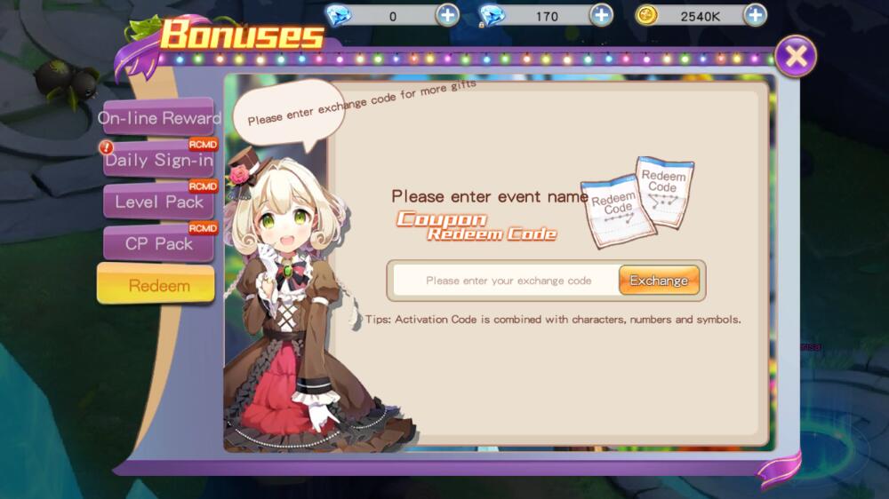 Step 3: Select item “Redeem”. Then enter the gift code in the table above into the text box. Press "Exchange" to get your reward.