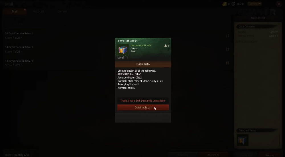 | MIRMGRANDOPEN | Active | ATK SPD Potion (M) x1. Accuracy Potion (S) x3. Normal Enhanced Stone Purity +3 x3. Forged stone x1. Normal food x5. |