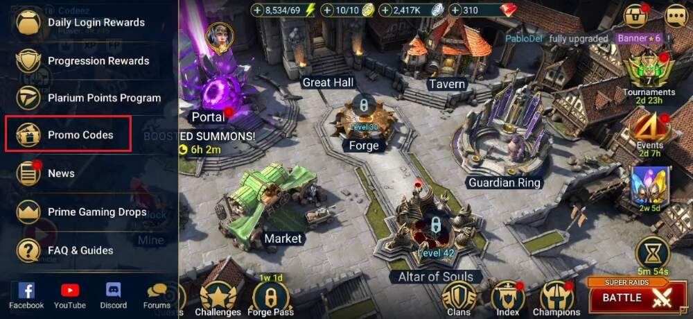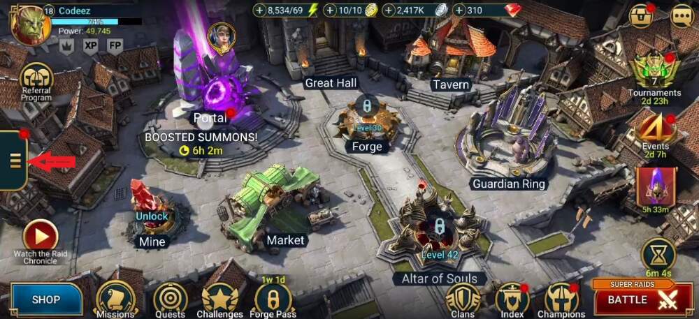 - Start the game Raid Shadow Legends and click on the . icon Menu on the left side of the screen.