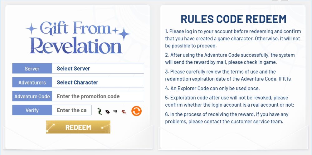 - After successful login. Please choose the correct server and the character you want to receive the gift. Next enter the code and verification code, press “Redeem”.