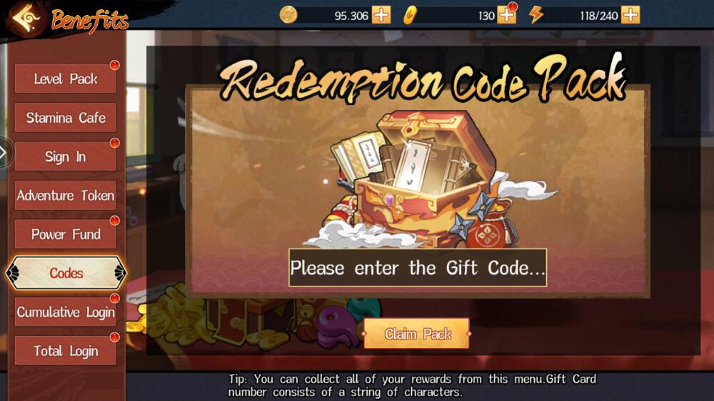 Step 3: Select item “Codes”. Enter the gift code in the table above into the text box. Then press "Claim Pack" to receive rewards.