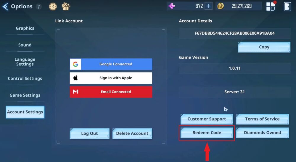 Step 4: Continue to select item "Account Settings". Then select the item “Redeem Code”.