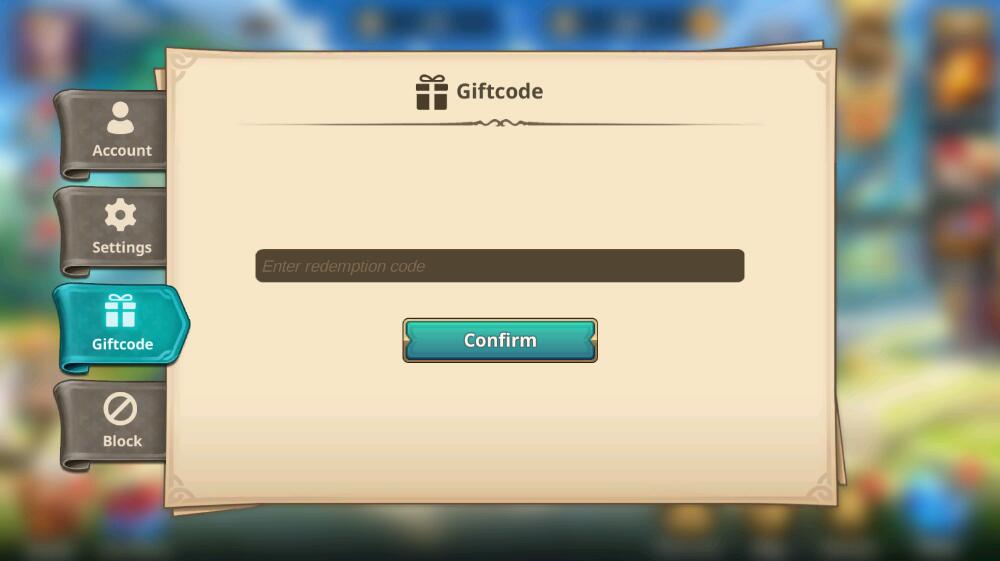 Step 3: Select item “Giftcode”. Then enter the gift code in the table above into the text box. Press "Confirm" to get your reward.
