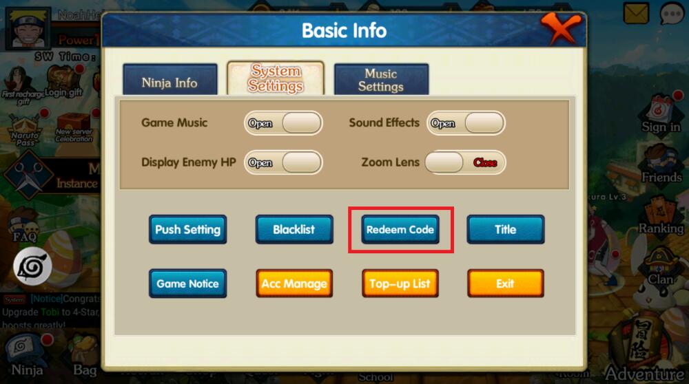 Step 3: Select the section “System Settings”. Then click on item “Redeem Code”.