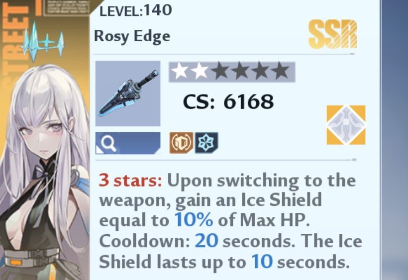 Raising Rosy Edge to 3 stars will grant Meryl one Ice Shield when switching to this weapon. This shield is equal to 10%HP, has a cooldown of 20 seconds and Ice Shield lasts up to 10 seconds.