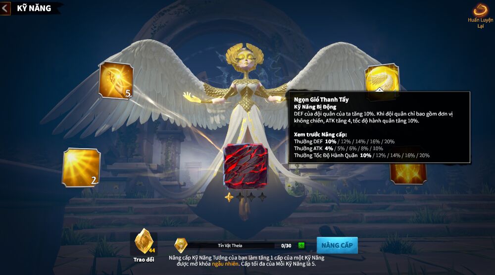 Passive skills “The Wind of Purification” will also help your angel magic army increase their speed and ATK significantly. Just combine Liliya and Theia with the white-winged angel, you will still activate all the bonus effects of this passive skill. To optimize the power of Theia and Liliya, you should Use Liliya as the main commander and follow the Skills branch.