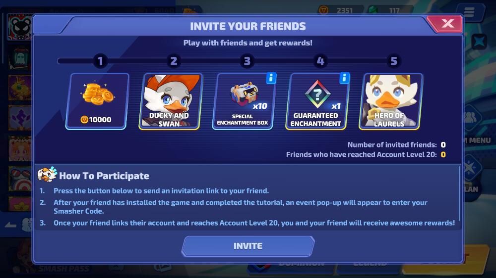 Ducky and Swan can only be obtained by inviting friends to play Smash Legends. You will need to invite at least 2 friends to get this legend!