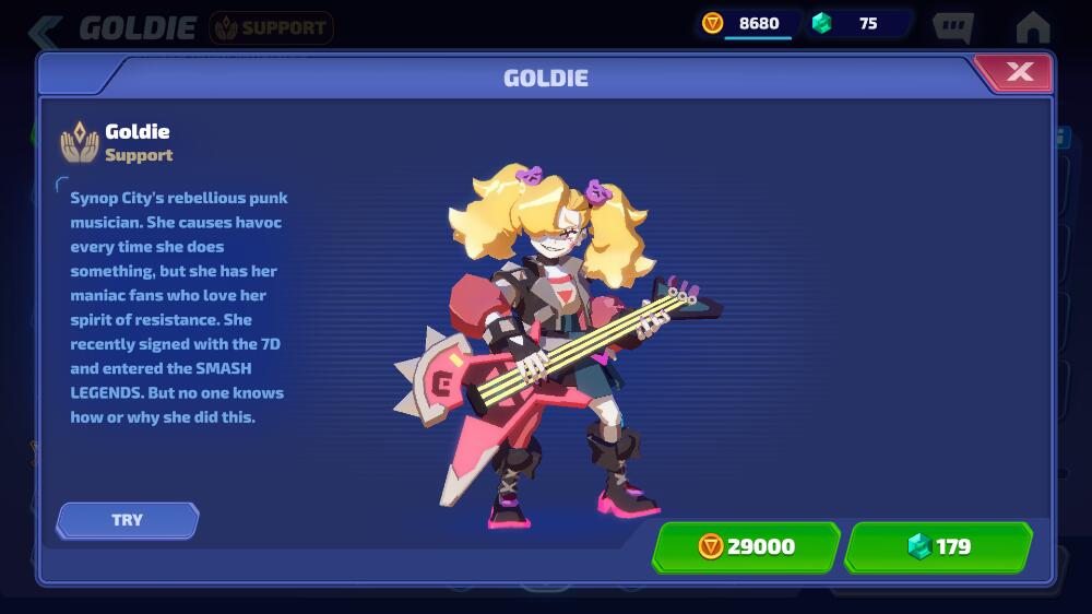 Goldie can be purchased with 29.000 Gold or 179 Gem from the Smash Legends in-game store.