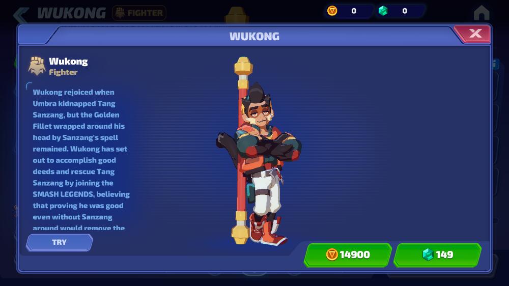 | Wukong is delighted when Umbra kidnaps Tripitaka Tang, but the golden scarf wrapped around his head due to the Tripitaka's magic remains. Wukong set out to do good deeds and rescue Tripitaka by joining Smash Legends, believing that proving he's good even without Tripitaka would make the headscarf disappear. |