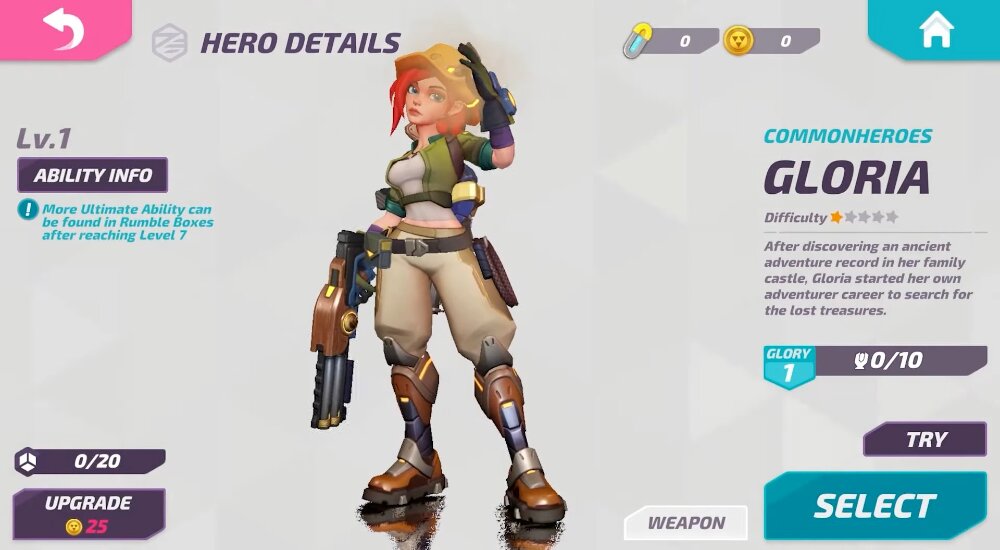 Gloria is a possible damage champion fighting in all situations or from any location. This makes her a very versatile hero. Make her a top level character. She can be easily unlocked through the Hall of Fame upon reaching 12 titles.