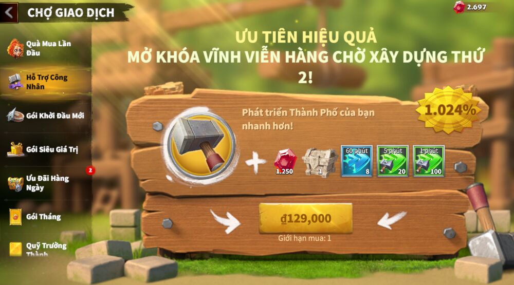 You can then purchase the second building queue with cash or gems. You can buy a two-day build queue for 150 gems or buy it permanently for 5000 gems. You can also buy a bundle for 129k that includes a second build queue and other items.