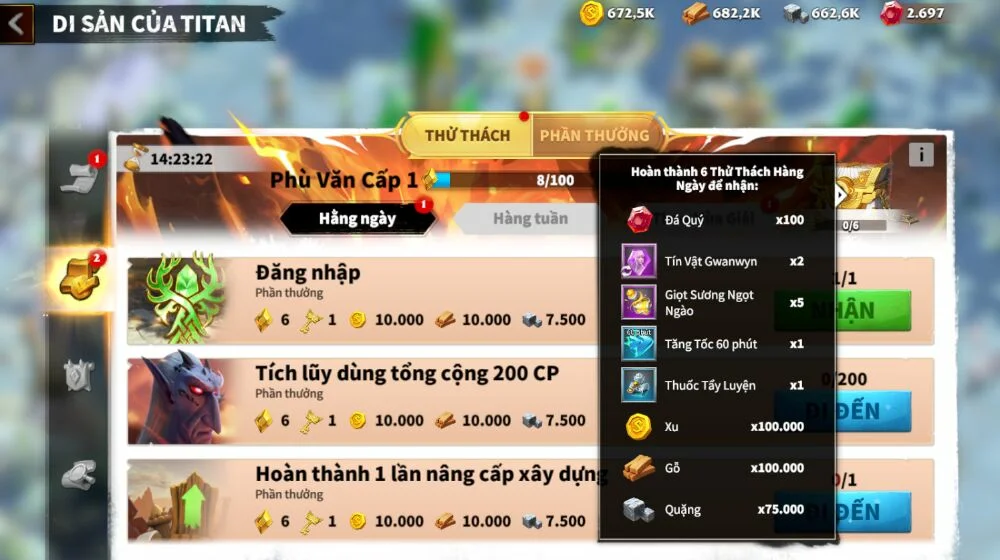 When you Complete 6 missions Every day, you will be rewarded with gifts including Hero Tokens, boosts, gems, and resources. Additionally, you will receive rune experience points for each challenge you complete, helping you upgrade your rune level in the Rune. As your rune level increases, you will receive more valuable rewards.