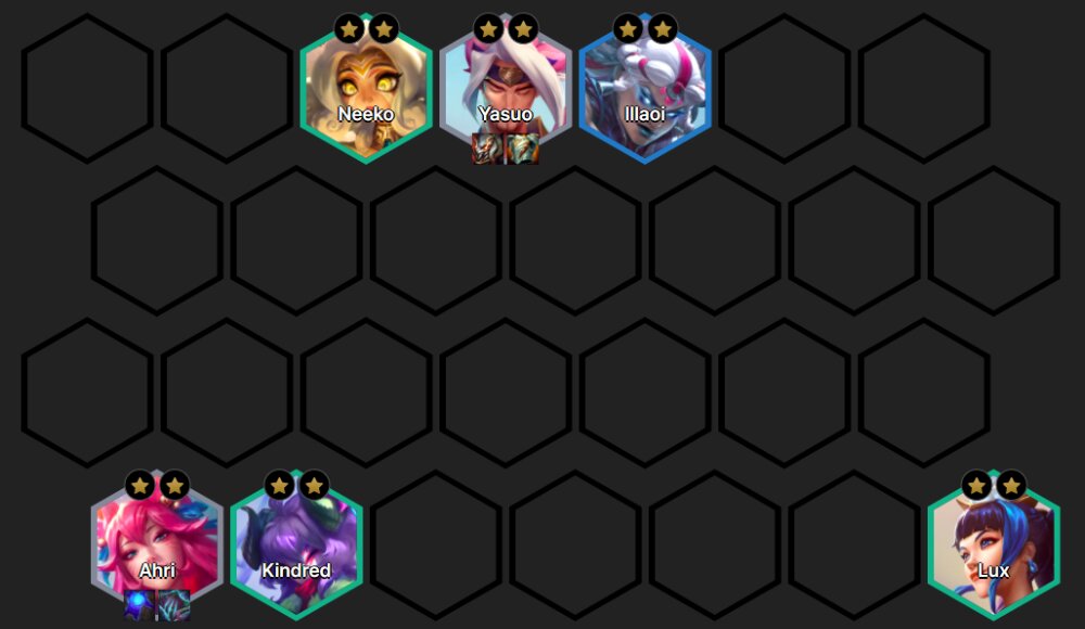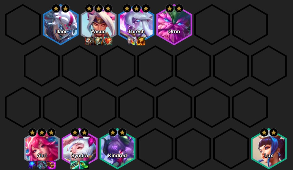 Ahri, Yasuo, Kindred, Lux, Illaoi, Thresh, Ornn, Syndra.