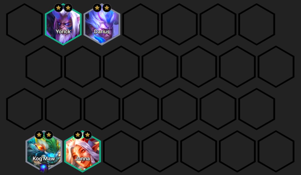 Start the game with losing streak to have priority in choosing equipment for the shopping round. Because you will need a lot of pieces Tear to optimize the squad. If defensive equipment pieces drop, you can optimize the defense on Darius or Yorick with the best health. Use Green Charm for Kog'Maw Holding Alune will optimize your squad's damage in the early stages.