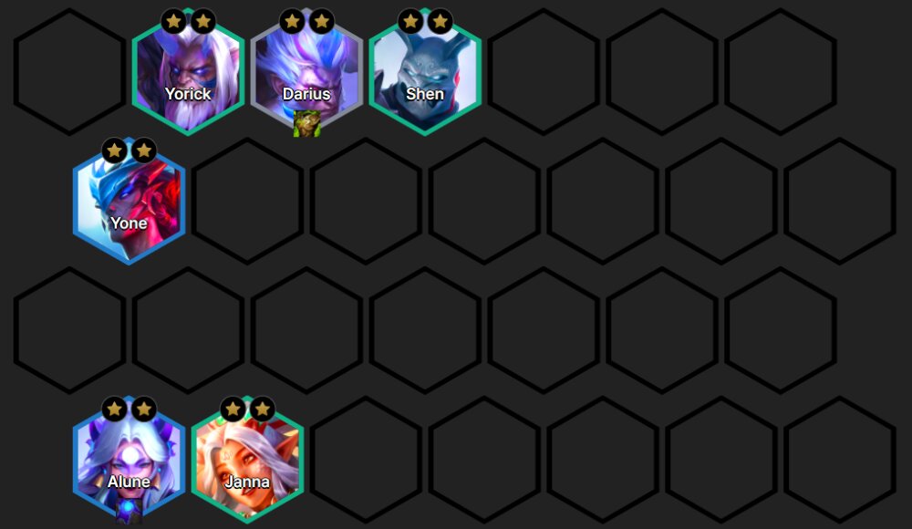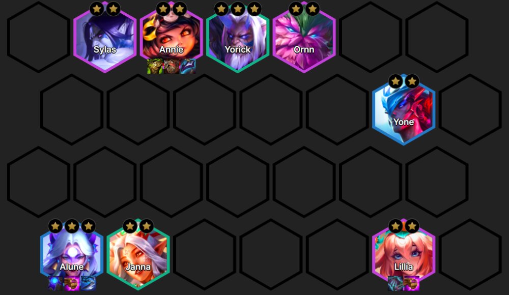 Janna, Yorick, Alune, Yone, Annie, Lillia, Ornn, Sylas.