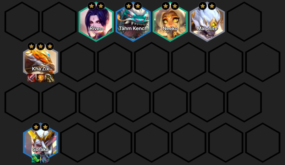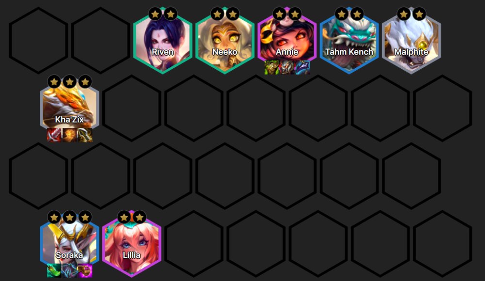 Kha'Zix, Malphite, Neeko, Riven, Soraka, Tahm Kench, Annie, Lillia.