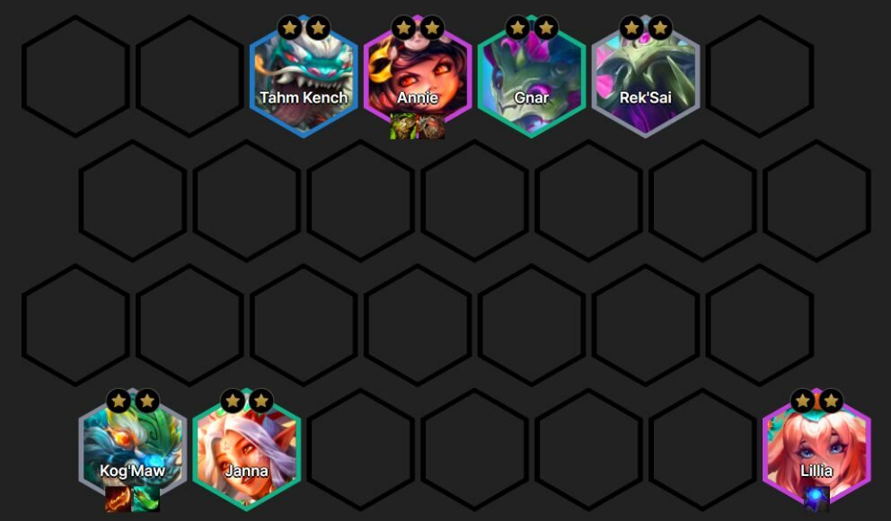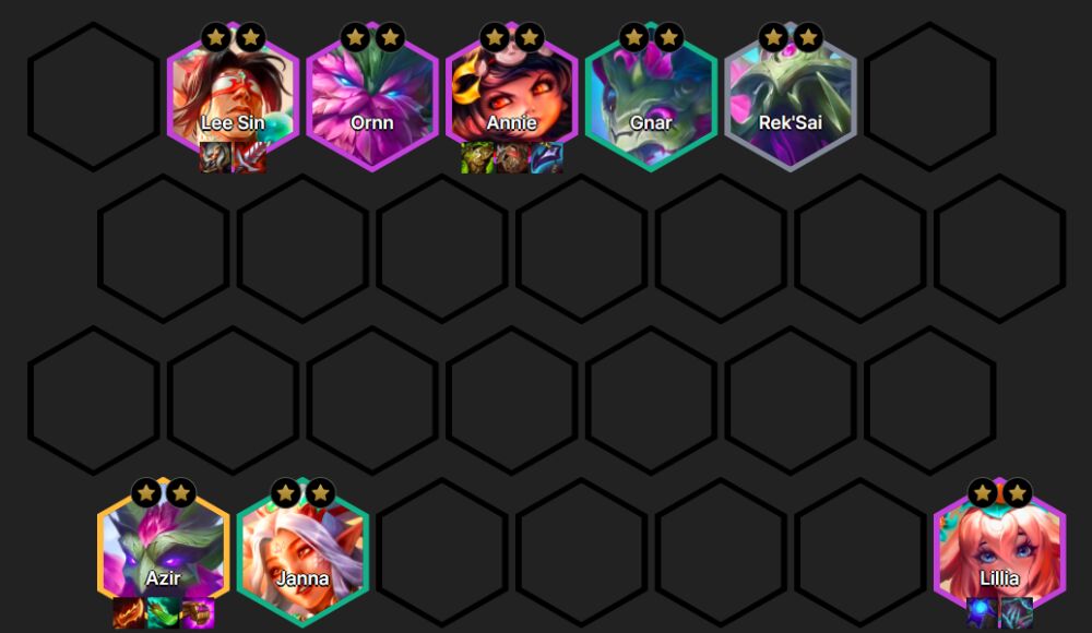 Rek'Sai, Gnar, Janna, Annie, Lee Sin, Lillia, Ornn, Azir.