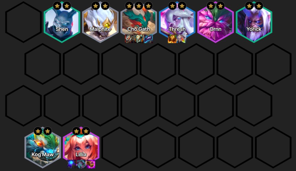 Cho'Gath, Kog'Maw, Malphite, Shen, Yorick, Thresh, Lillia, Ornn.