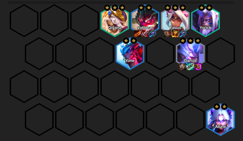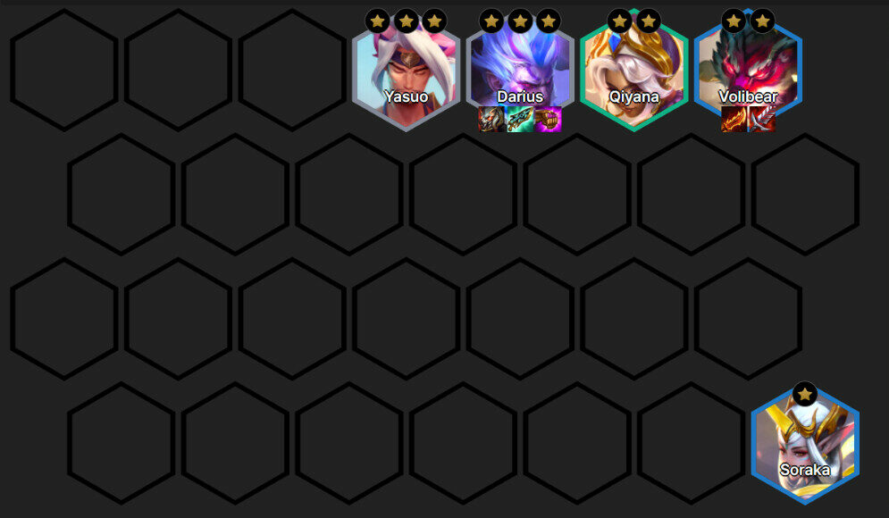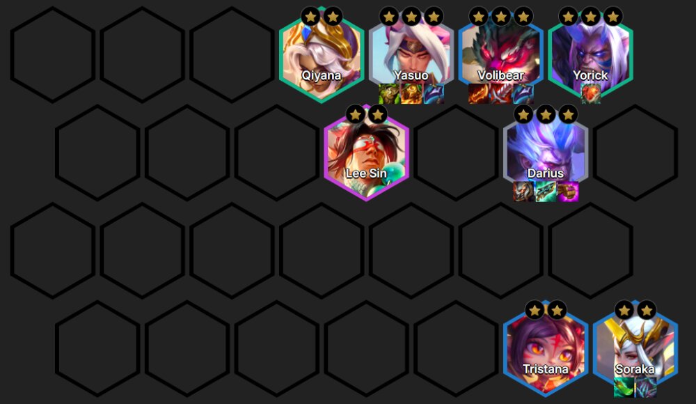 Darius, Yasuo, Qiyana, Yorick, Soraka, Tristana, Volibear, LeeSin.