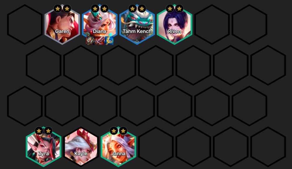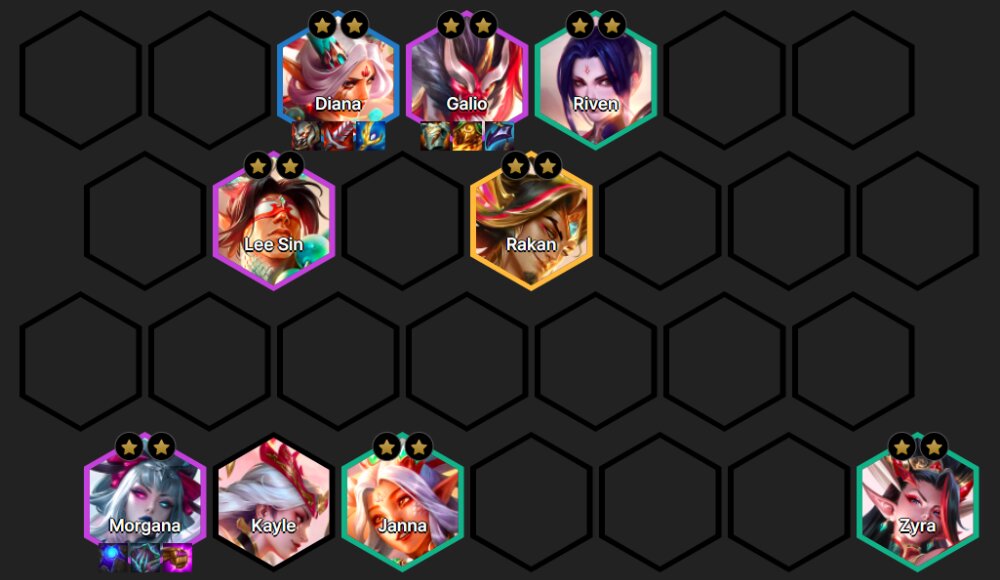 Janna, Riven, Zyra, Diana, Galio, Lee Sin, Morgana, Rakan.