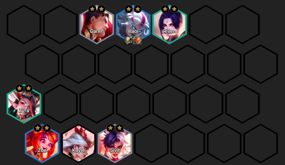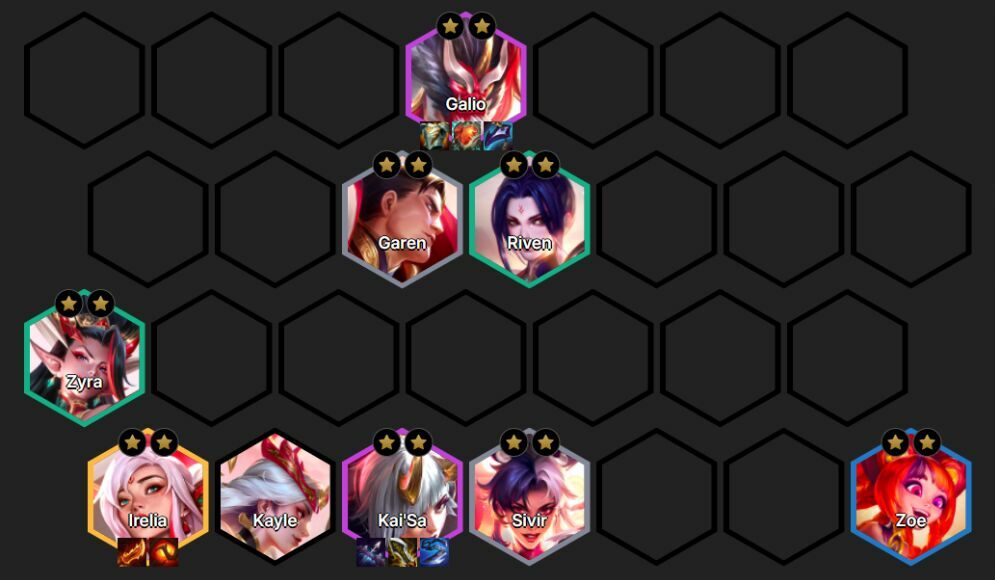 Garen, Sivir, Riven, Zyra, Zoe, Galio, Kai'Sa, Irelia.