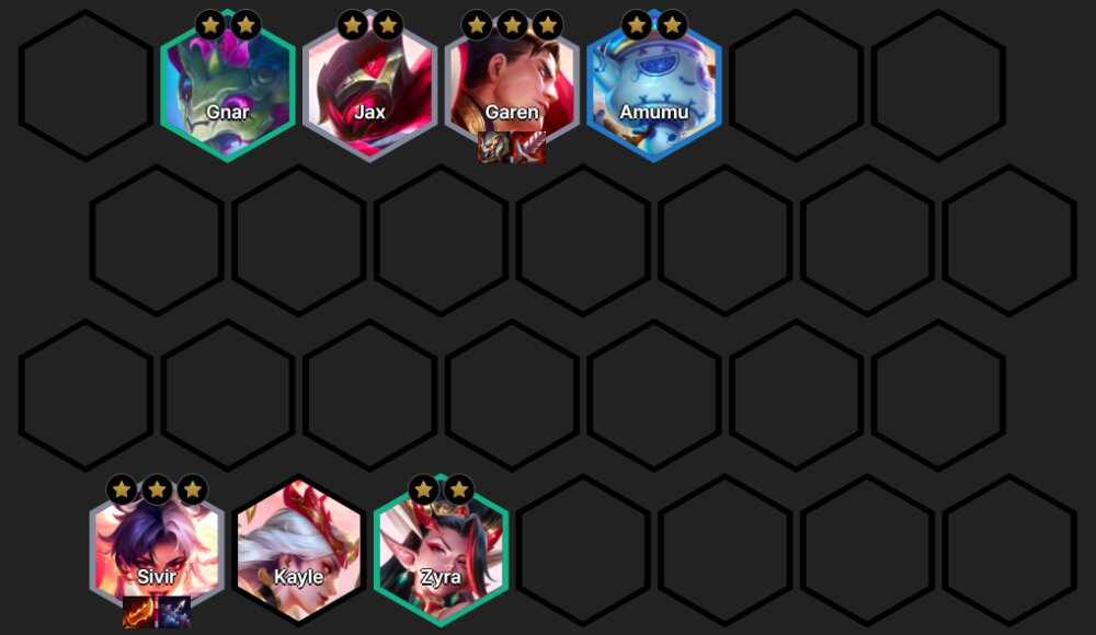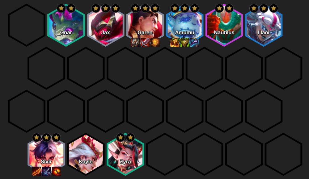 Garen, Jax, Sivir, Gnar, Zyra, Amumu, Illaoi, Nautilus.