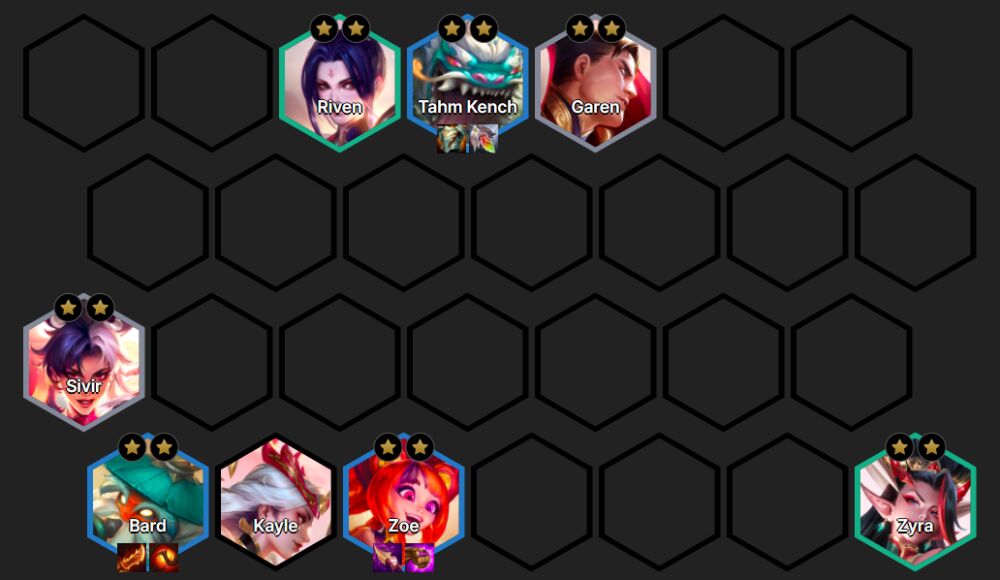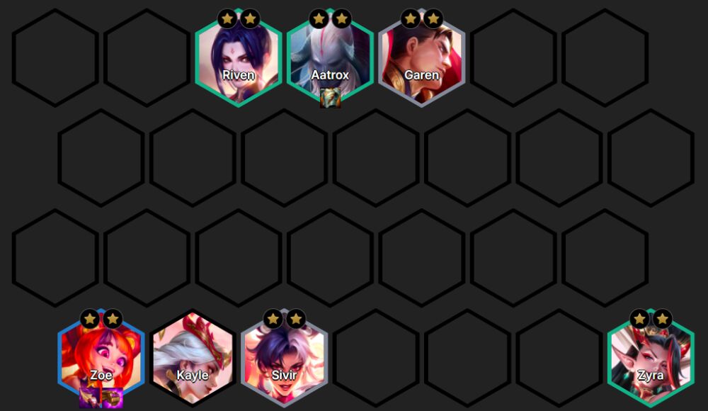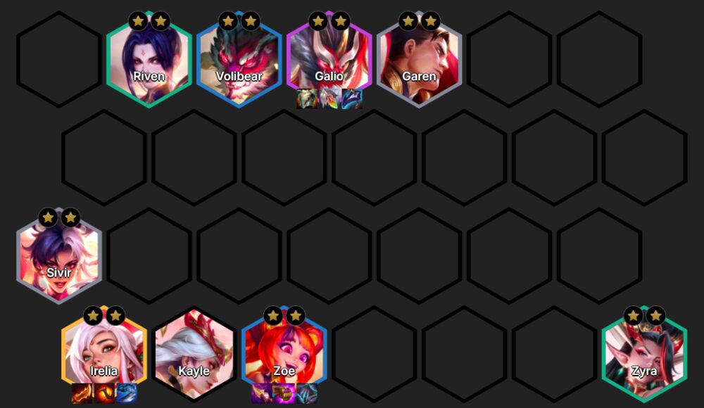 Garen, Sivir, Riven, Zyra, Zoe, Volibear, Galio, Irelia.
