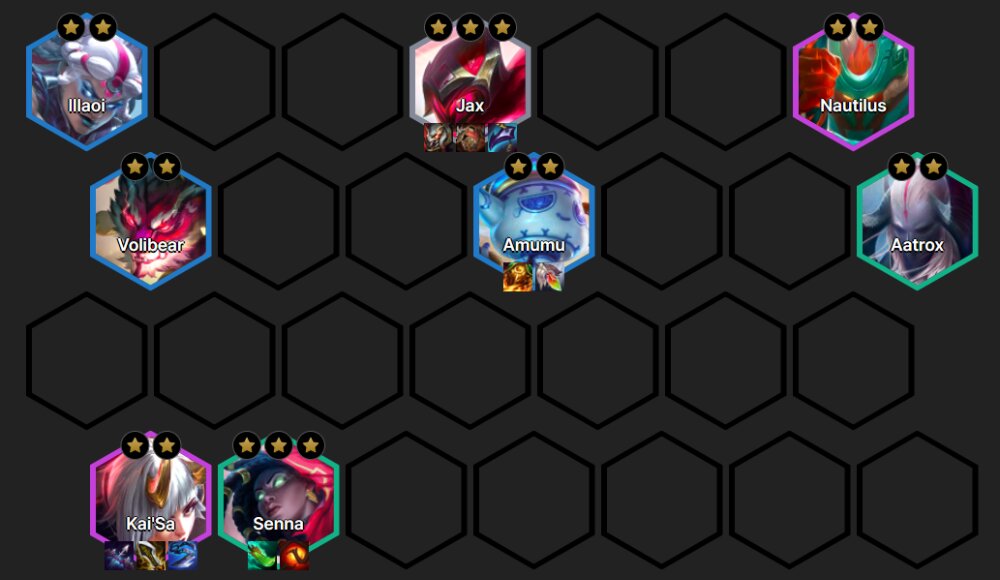 Jax, Aatrox, Senna, Amumu, Illaoi, Volibear, Kai'Sa, Nautilus.