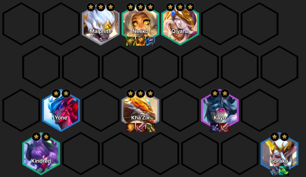 Kha'Zix, Malphite, Kindred, Neeko, Qiyana, Soraka, Yone, Kayn.