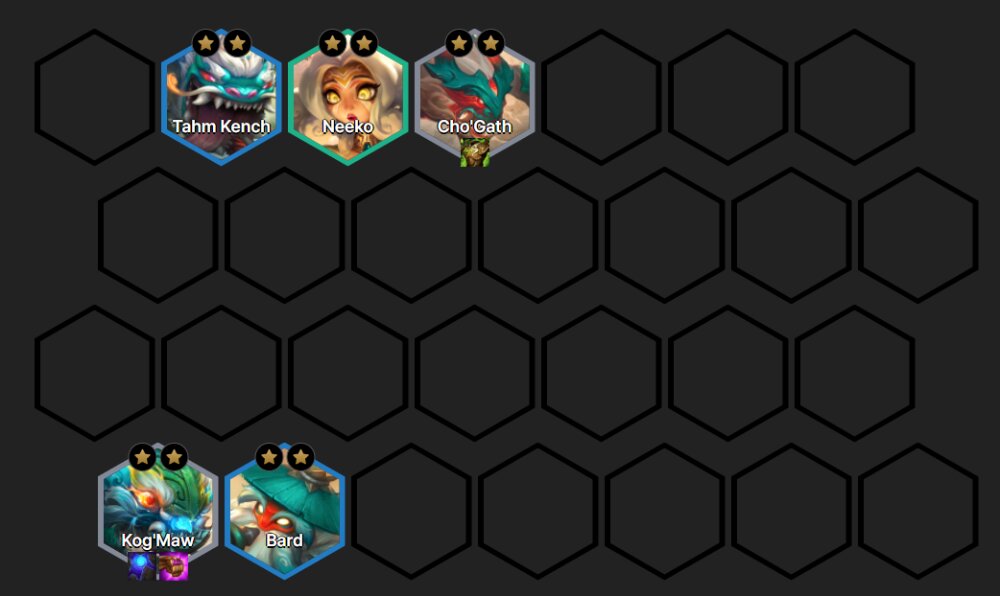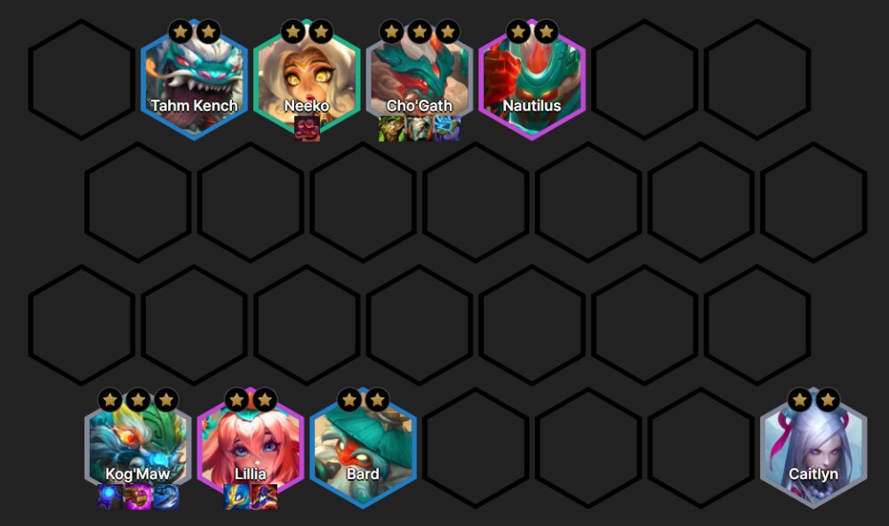 Tahm Kench, Neeko, Cho'Gath, Nautilus, Kog'Maw, Lillia, Bard, Caitlyn.