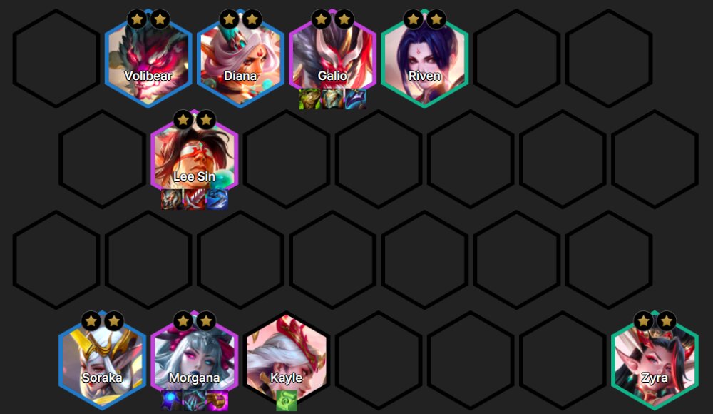 Riven, Zyra, Diana, Soraka, Volibear, Galio, Morgana, Lee Sin.