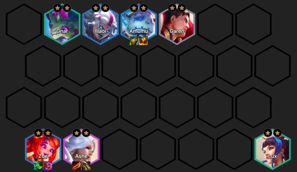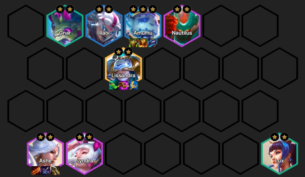 Gnar, Lux, Amumu, Illaoi, Ashe, Nautilus, Syndra, Lissandra.