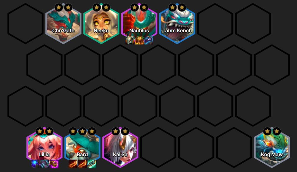 Cho'Gath, Kog'Maw, Neeko, Bard, Tahm Kench, Kai'Sa, Lillia, Nautilus.